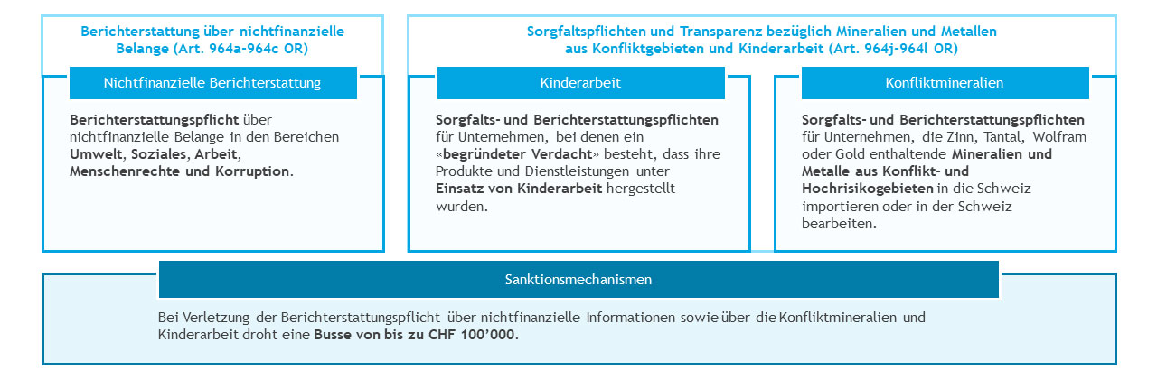Am 1. Januar 2022 setzte der Bundesrat im Obligationenrecht (Art. 964 OR) und den Ausführungsbestimmungen in der Verordnung über Sorgfaltspflichten und Transparenz bezüglich Mineralien und Metallen aus Konfliktgebieten und Kinderarbeit (VSoTr) die neuen Bestimmungen zum indirekten Gegenvorschlag der Konzernverantwortungsinitiative (KVI) in Kraft. Die neuen Sorgfalts- und Berichterstattungspflichten zu Nachhaltigkeitsthemen kommen erstmals im Geschäftsjahr 2023 zur Anwendung und müssen 2024 veröffentlicht werden.