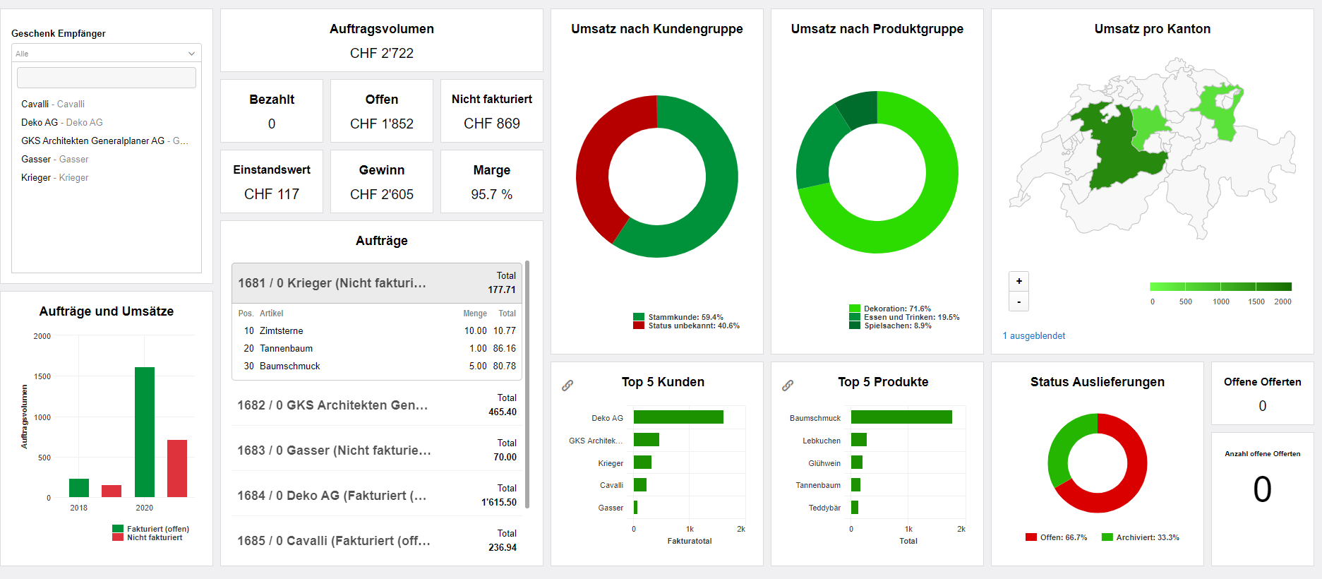 Die Weihnachts AG erhält mit dem Auftragsbearbeitungs-Dashboard «Aufträge und Umsätze» einen schnellen, übersichtlichen und aussagekräftigen Überblick über die wichtigsten Kennzahlen.