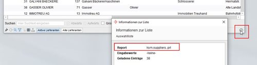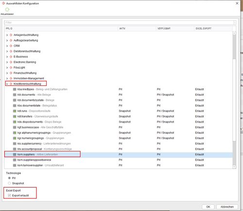 Öffnen Sie das Programm «K623». Über «Extras - Auswahllisten Konfiguration» suchen Sie nun in der gewünschten Applikation nach dem Report-Namen «ksm.suppliers..prl». Setzen Sie zum Schluss im Feld «Excel Export erlaubt» den Haken.