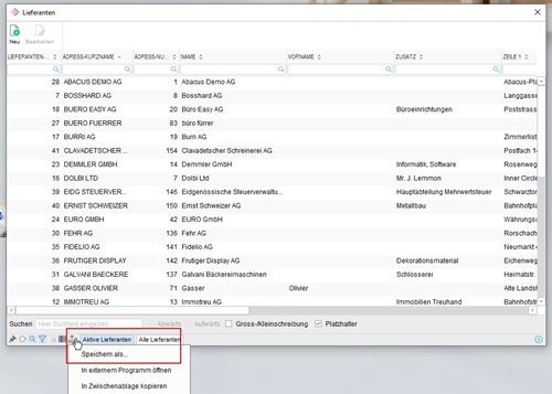 Öffnen Sie das Programm «K11» erneut. Sie können die Auswahlliste der Lieferanten jetzt exportieren und als Excel-Datei abspeichern.