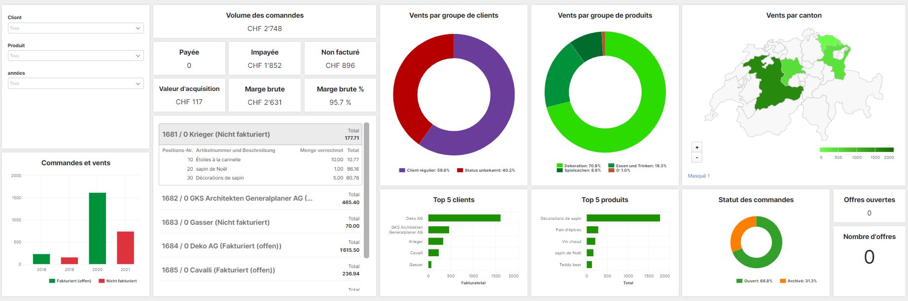 Grâce au tableau de bord du traitement des commandes «Commandes et chiffres d'affaires», l’entreprise Noël SA dispose d'un aperçu clair et rapide des principaux indicateurs.