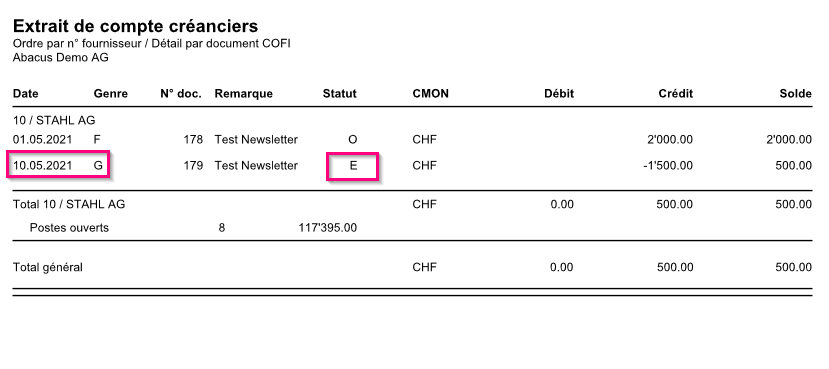 Dans le programme K32, vous pouvez encore vérifier la compensation dans l’extrait de compte créanciers: Le statut de la note de frais est désormais un «E» qui signifie que c’est effectué. Le montant restant de la facture sera pris en compte au cours du prochain traitement disponible, pour autant qu’il ne soit pas lui aussi compensé. Dès que ce montant aura été entièrement réglé, son statut sera aussi «E».