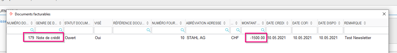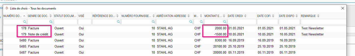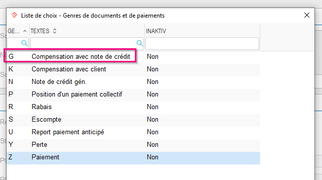 Choisissez le type «compensation avec note de crédit» et faites un double-clic: