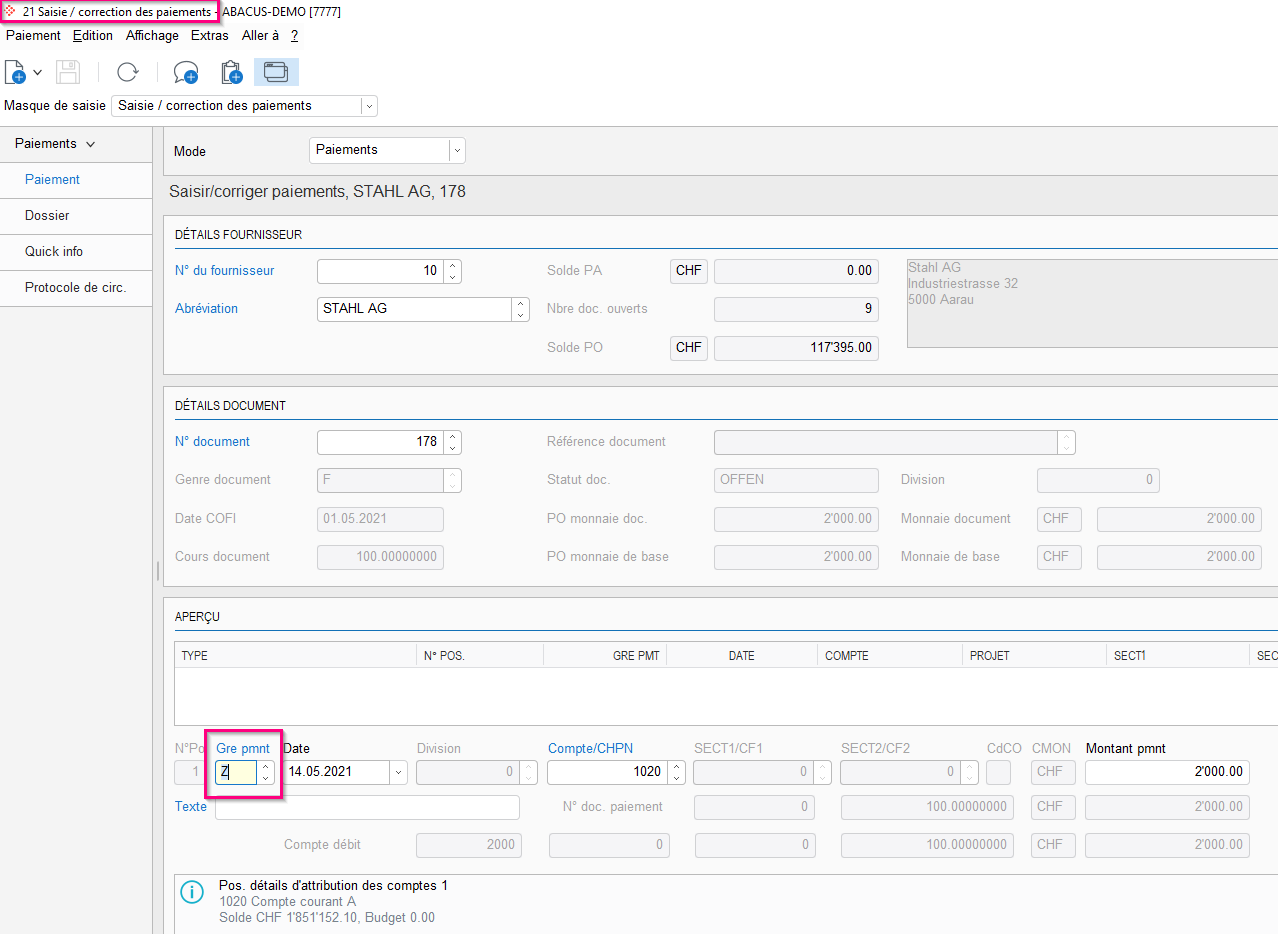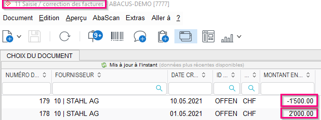 Le fournisseur Stahl AG vous a envoyé une facture et une note de crédit. Abacus vous permet de les compenser facilement de sorte qu’il ne vous reste qu’un seul montant à régler.